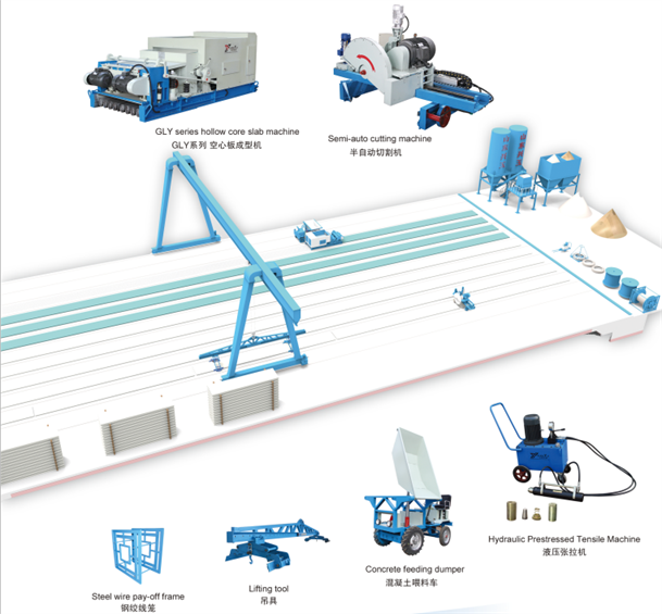 GLY系列的空心板機是先做好混凝土平臺上生產作業,預先張拉好高強度、低松弛鋼絞線,運用擠壓推進的工作原理來制造混凝土空心板,所生產出來的板材具表面光滑,密實度高、跨度大等優點。生產出的空心板長度可在4. 2米到18米的范圍內任意切割,主要用于建造大開間廠房、住宅、學校、醫院、商場、辦公樓和大型倉庫等建筑物。